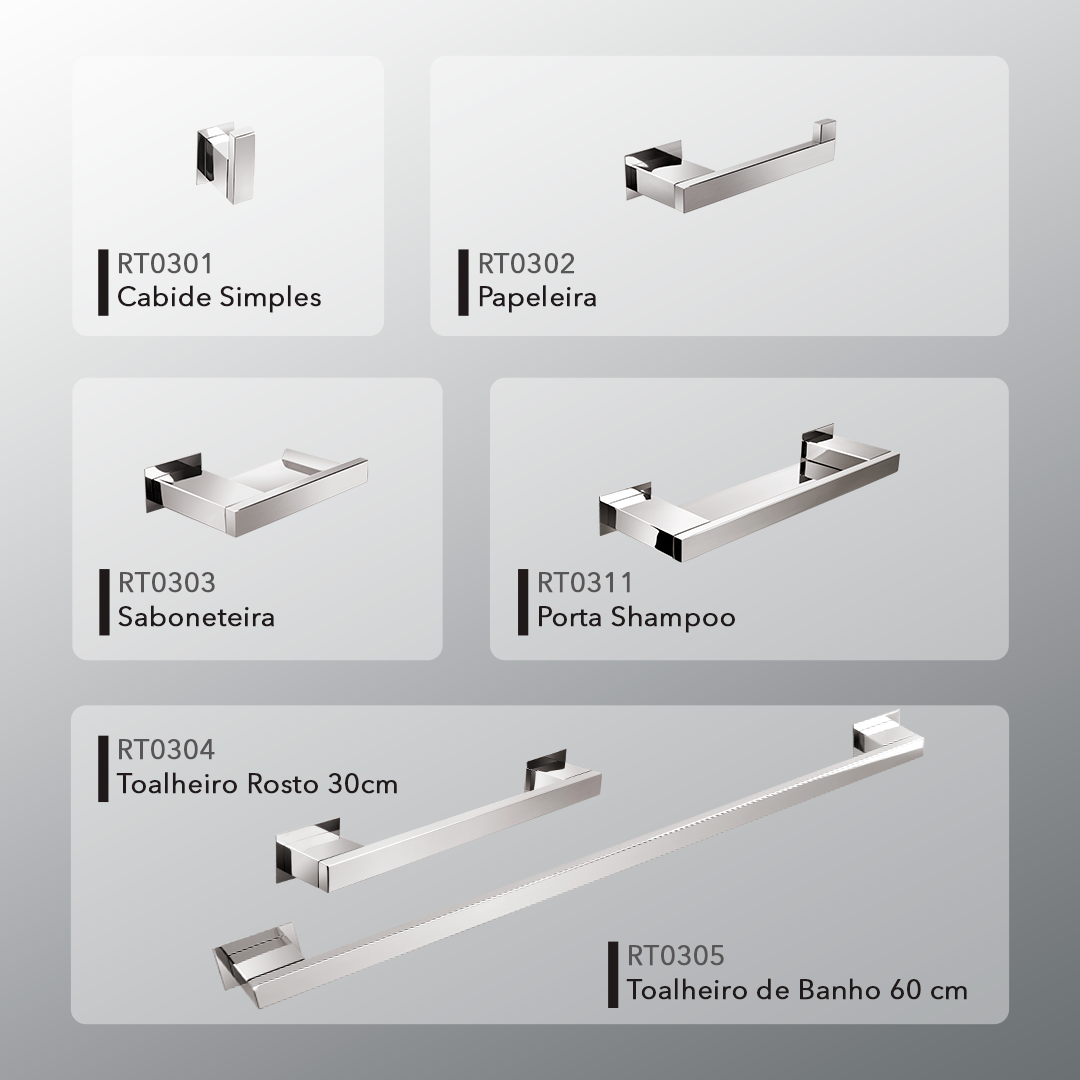 Ref.: KITRT4 contém: Cabide Simples, Papeleira, Toalheiro de rosto 30 cm, Toalheiro de banho 60 cm.