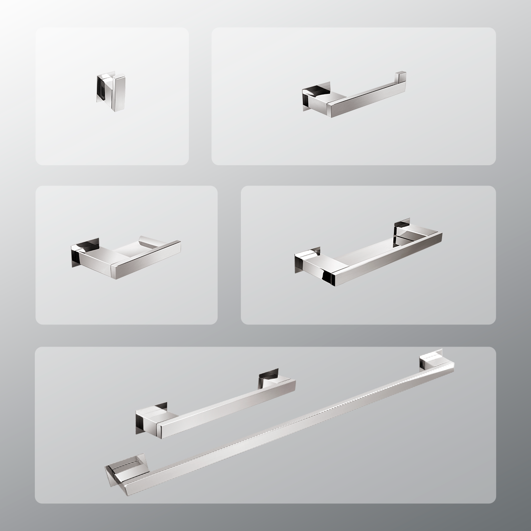 Ref.: KITRT6: contém: Cabide Simples, Papeleira, Saboneteira, Toalheiro de rosto 30 cm, toalheiro de banho 60 cm, Porta Shampoo.