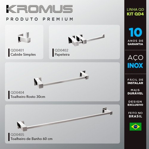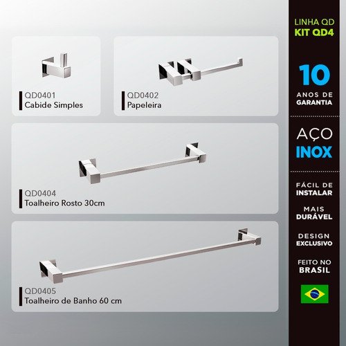 Ref.: KITQD4 contém: Cabide Simples, Papeleira, Toalheiro de rosto 30 cm, Toalheiro de banho 60 cm.