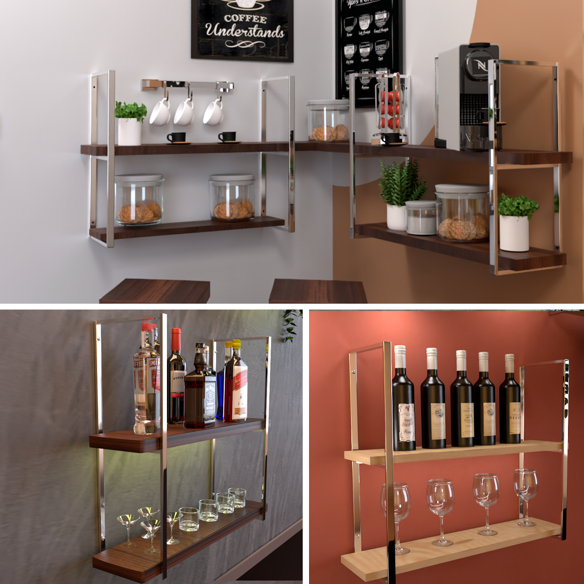 Informações gerais do produto e utilização: Suportes modulares, podendo ser compostos com prateleiras de madeira, vidro ou outros materiais de sua escolha, deixando quaisquer ambientes mais modernos e elegantes como, salas, halls, cozinhas, espaços gourmet, banheiros, quartos, garagens, escritórios, anexos e outros, abrindo um leque enorme de opções de utilização. Suportam até 10kg por suporte