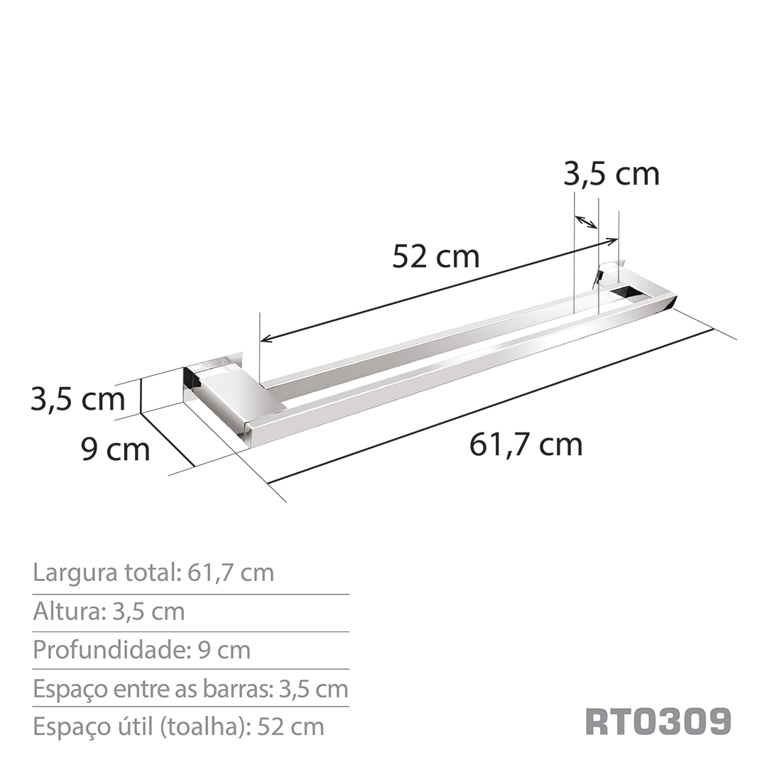 Informações gerais do produto: Toalheiro Duplo 60 cm, utilizado para pendurar toalhas de banho e casal.