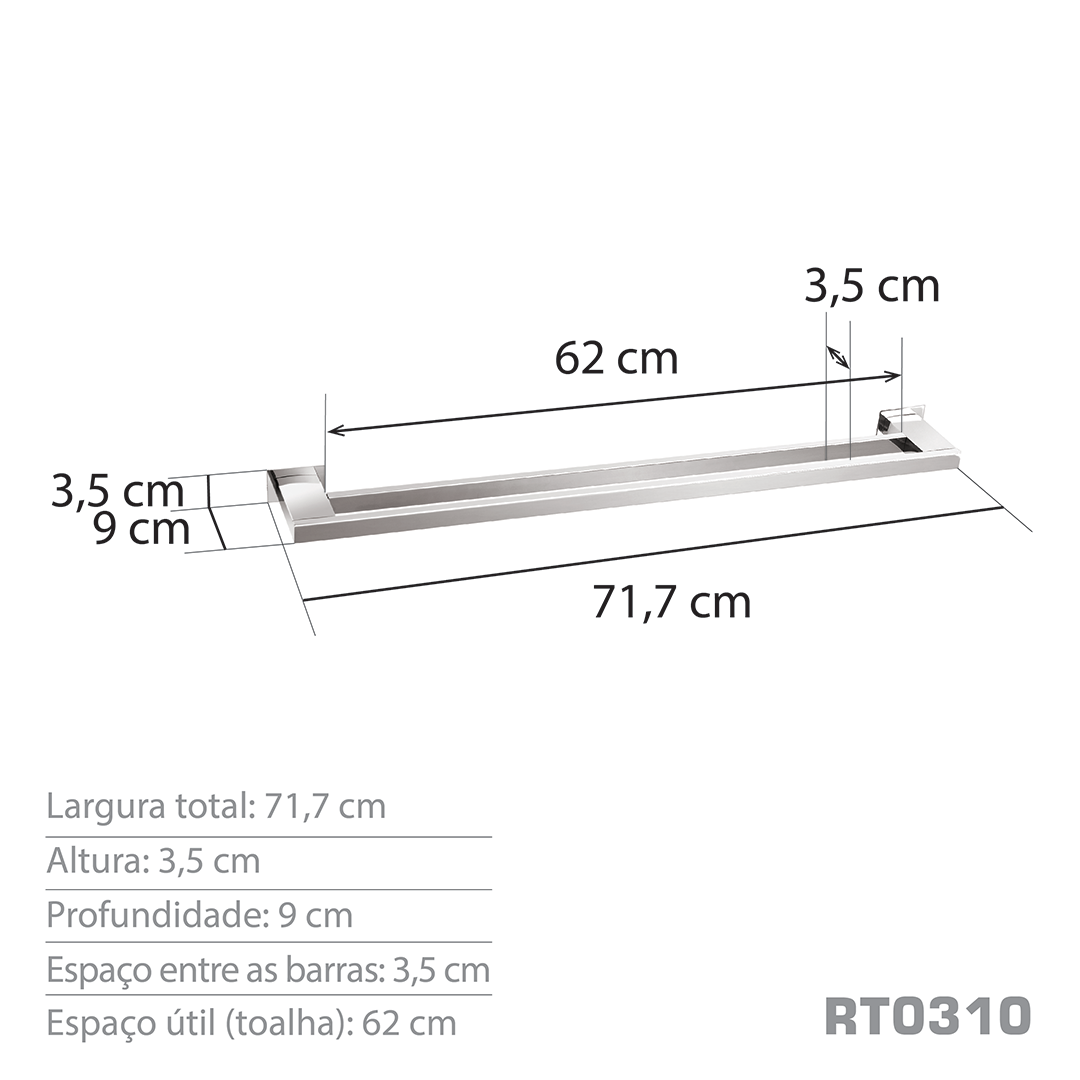 Informações gerais do produto: Toalheiro Duplo 70 cm, utilizado para pendurar toalhas maiores e de casal.