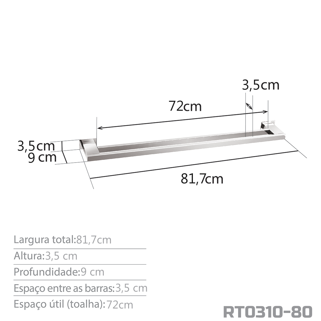 Informações gerais do produto: Toalheiro Duplo 80 cm, utilizado para pendurar toalhas maiores e de casal.