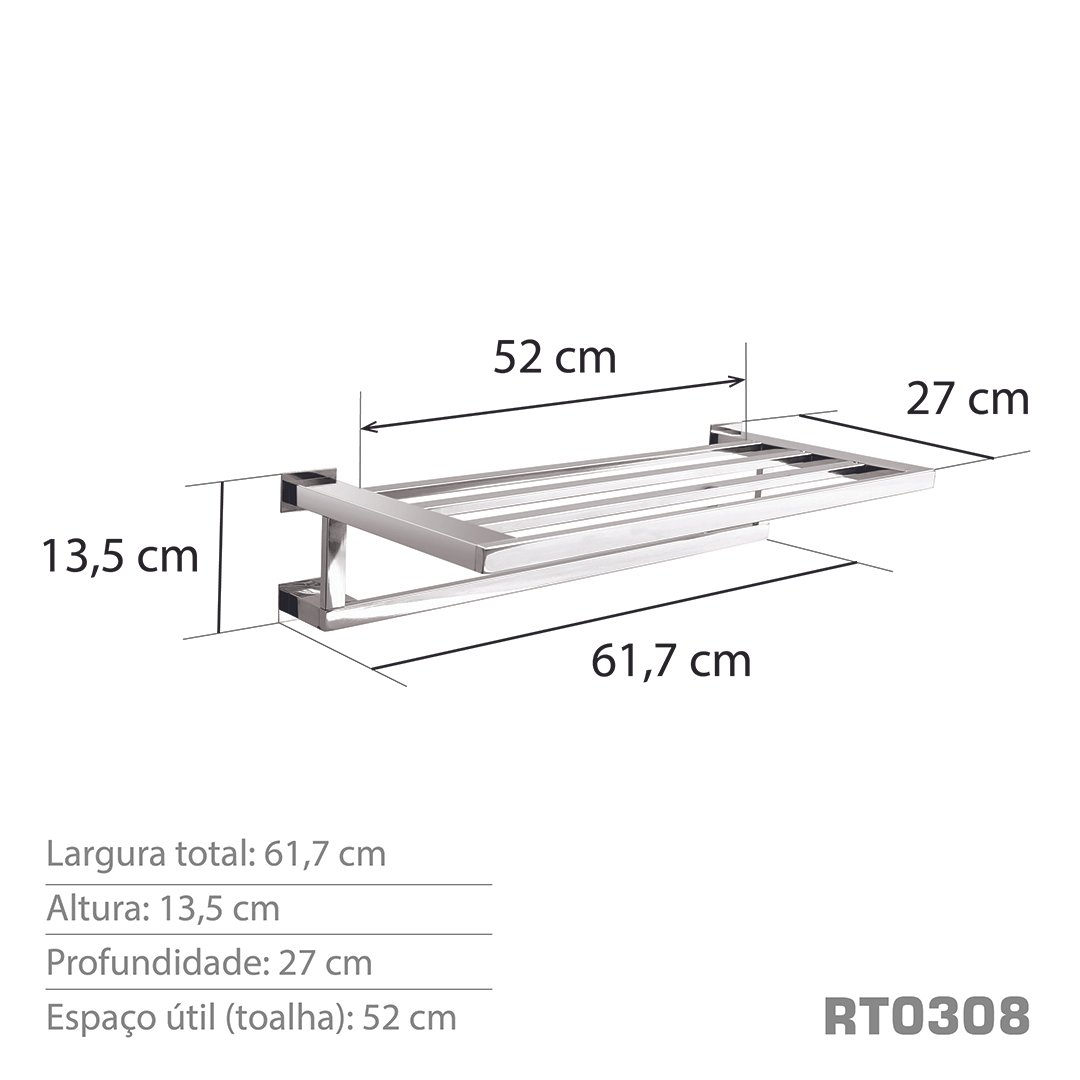 Informações gerais do produto: Toalheiro Rack de 60 cm, utilizado para pendurar várias toalhas ao mesmo tempo, ou simplesmente, colocá-las dobradas em cima da grade e pendurar uma de uso, conforme sua preferência.