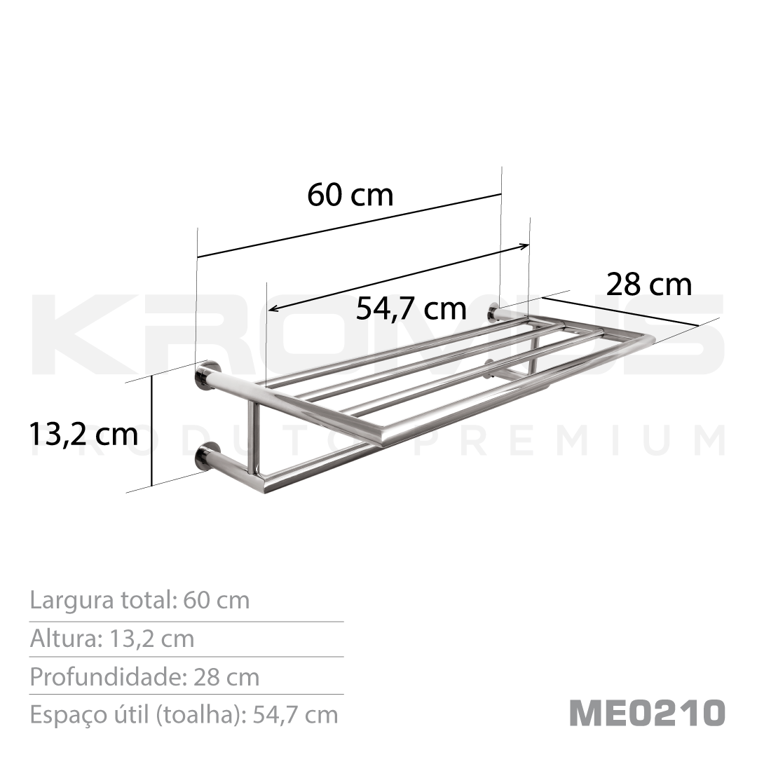 Informações gerais do produto: Toalheiro Rack de 60 cm, utilizado para pendurar várias toalhas ao mesmo tempo, ou simplesmente, colocá-las dobradas em cima da grade e pendurar uma de uso, conforme sua preferência.